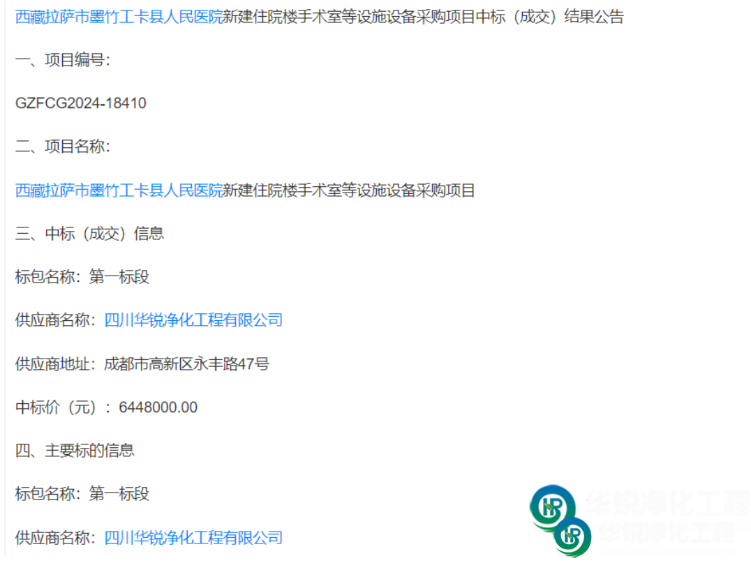 四川華銳凈化工程有限公司中標(biāo)西藏拉薩墨竹工卡醫(yī)院凈化工程手術(shù)室建設(shè)項(xiàng)目